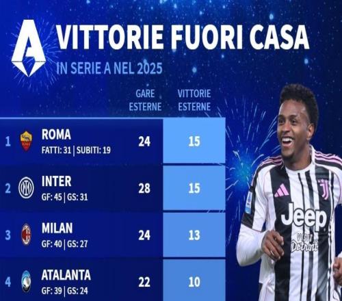 意甲球隊2025年客場成績:羅馬、國米15勝第1,尤文21戰(zhàn)僅8勝