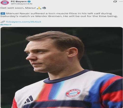 官方:拜仁宣布諾伊爾在周六對不萊梅的比賽中左小腿肌肉纖維撕裂,他將缺陣一段時間。